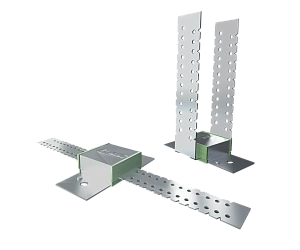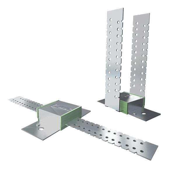 Крепление представляет собой прямой перфорированный подвес (толщина стали 1мм), расположенный между двумя виброизолирующими прокладками из качественного эластомера. Такая структура позволяет разорвать жесткие связи с металлическим каркасом конструкций при монтаже профильной системы и добиться высоких показателей по виброизоляции.